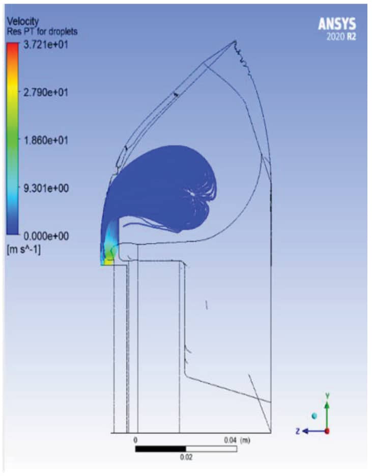 The study was conducted using computational fluid dynamics modeling of the EXHALO™ Shield in conjunction with an oxygen mask. Researchers observed the release of 1000 2.5 micron particles (the optimal particle size for lung deposition). They used varying flowrates of 0, 10, 50 and 100 L/min. The flowrates represent the various vacuum systems used in hospitals ranging from portable suction units to full-wall vacuums. Inlet boundary conditions mimicked an 11 L/min breathing rate.